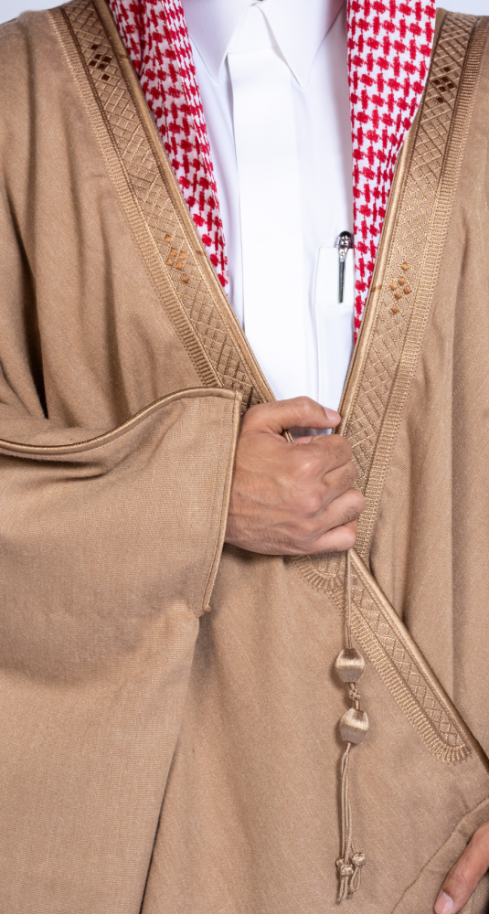 للحصول على إطلالة متكاملة، نوصي بتنسيق البشت مع ألوان مثل البيج، الكريمي، أو الأسود، مما يُبرز عمق اللون العودي وجمال تفاصيل التطريز الذهبي.