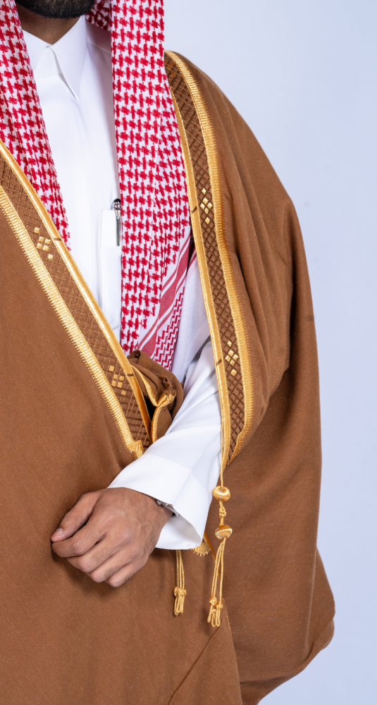 للحصول على إطلالة متكاملة، نوصي بتنسيق البشت مع ألوان مثل البيج، الكريمي، أو الأسود، مما يُبرز عمق اللون العودي وجمال تفاصيل التطريز الذهبي.