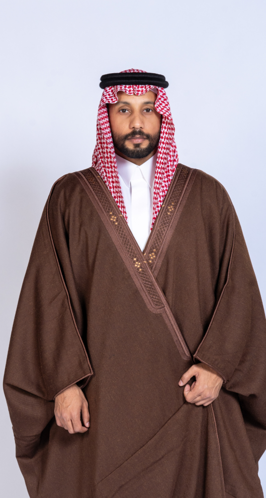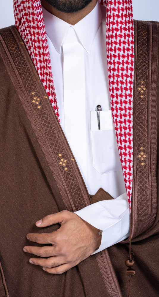 للحصول على إطلالة متكاملة، نوصي بتنسيق البشت مع ألوان مثل البيج، الكريمي، أو الأسود، مما يُبرز عمق اللون العودي وجمال تفاصيل التطريز الذهبي.