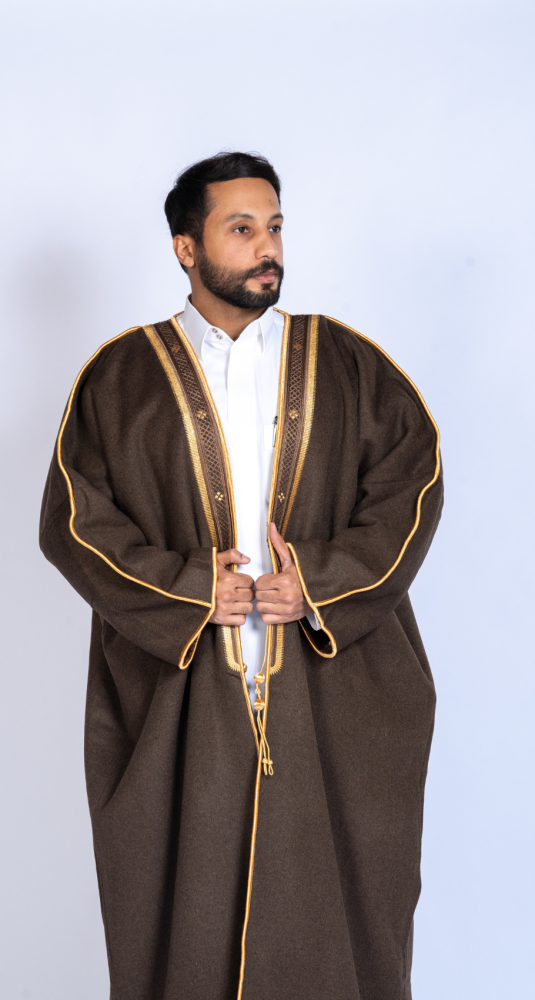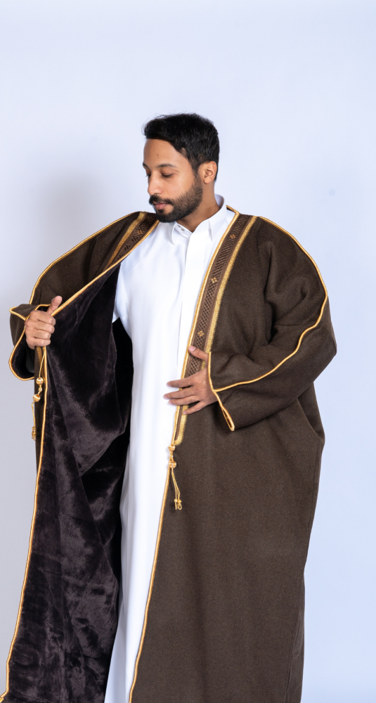 استمتع بالدفء والفخامة مع فروة وقار المصممة بأسلوب يحاكي أناقة البشت، تتميز بتطريز فاخر يغطي كامل الصدر، مع بنود وأطراف مزينة بلمسات ذهبية تضفي عليها طابعاً من الرقي والجمال.