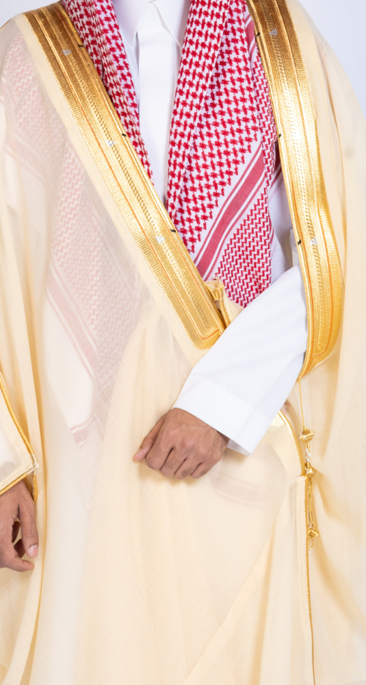 البشت الملكي الصيفي الليموني يأتي كتحفة فنية ترثي للعادات والتقاليد السامية، بتفاصيلها التي تنطق بالفخامة والرقي.